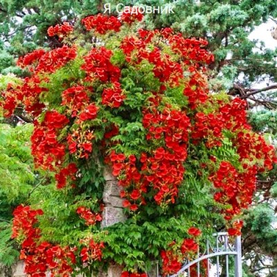 Кампсис красный — это лиана, которая может расти до 10 метров в высоту. Её побеги каждый год отрастают от старых ветвей. В июне растение особенно красиво: его стебли покрыты тёмно-зелёной листвой, на фоне которой выделяются красные цветы.